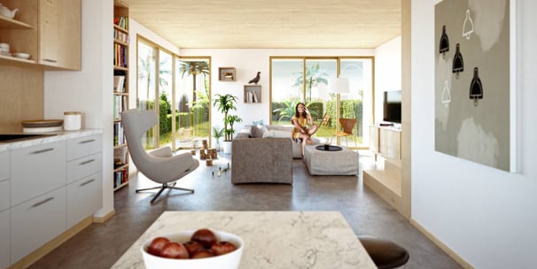 Wohnbereich mit exklusiver Pool- & Parklandschaft nur für Bewohner in neuer innovativer Holzbauweise für besonders angenehmes Raumklima.
