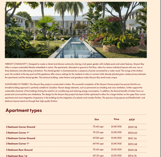 Moyoni Bay setzt auf eine einzigartige, gemeinschaftsorientierte Architektur, die eine dichte, grüne Gartenlandschaft mit mehreren Pools und Wasserelementen umfasst. Im Gegensatz zu anderen Projekten in Fumba Town, die meist auf separierte Grundstücke setzen, fördert Moyoni Bay das Gemeinschaftsgefühl, während gleichzeitig Privatsphäre durch den üppigen Pflanzenbewuchs gewährleistet wird. Die verschiedenen Entspannungszonen im Garten, wie Schaukeln im Flachwasserbecken, Sonnendecks und Pavillons, bieten den Bewohnern zahlreiche Orte, um zu entspannen oder soziale Kontakte zu pflegen.