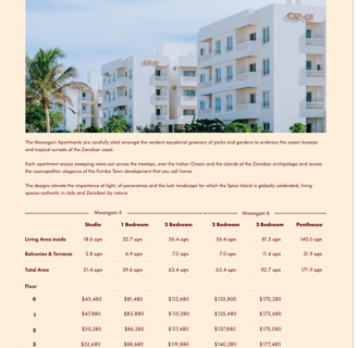 Die Mwangani SkyLofts bieten einen spektakulären Ausblick auf das Meer und Fumba Town. Besonders die oberen Etagen ermöglichen eine unvergleichliche Aussicht, die den Wohnraum in eine lichtdurchflutete Oase verwandelt.